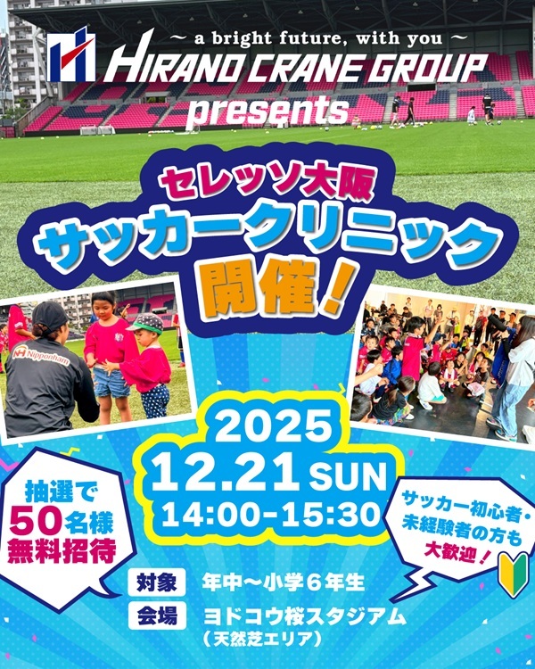 セレッソ大阪オフィシャルパートナー 平野クレーン工業株式会社による、お子様を対象とした平野クレーン工業presentsサッカークリニックを開催いたします。